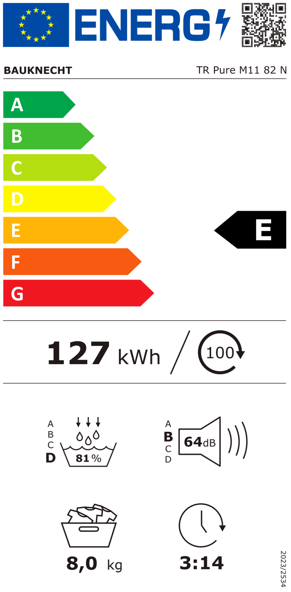 Das Modell TR Pure M11 82 N ist ein Wärmepumpentrockner von Bauknecht. Ausgezeichnet mit der Energieeffizienzklasse A++ und einem geschätzten Jahres-Energieverbrauch von 234 kWh überzeugt der Bauknecht TR Pure M11 82 N unter anderem im Hinblick auf die Strombilanz. Für Familien ist das Standgerät mit einem Fassungsvermögen von 8 kg ideal.