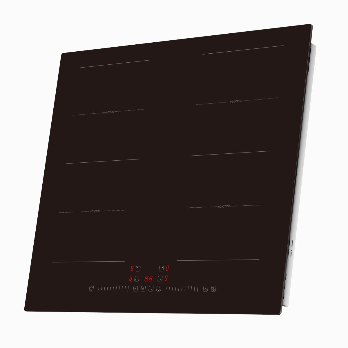 Das Gerät wird mit Sensortasten bedient. Das Induktionskochfeld misst 59 cm x 52 cm x 6,2 cm und wiegt 8 kg.