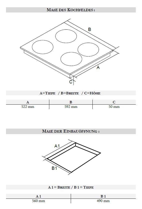 Maße Arbeitsplatten-Ausschnitt (B x T) : 56,00 x 49,00 cm